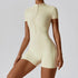 This jumpsuit is made from nylon fabric for moisture absorption and breathability. It features a pullover style with a waist-length fit and short sleeves. Available in multiple colors. Ideal for yoga, fitness, and dance with a tight clothing style.